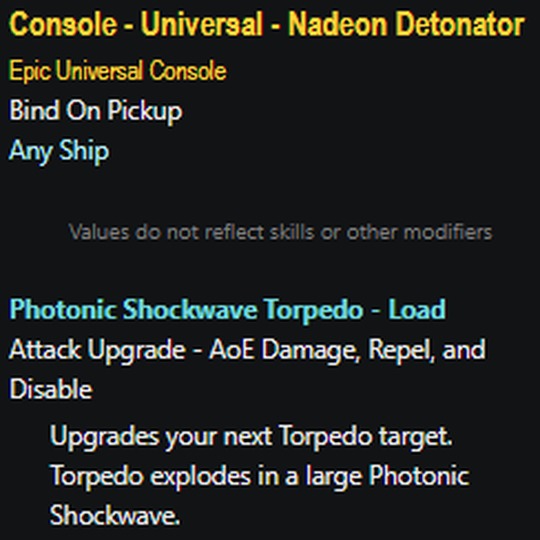 The Nadeon Detonator is universal and may be placed in any console slot. The Bio-Neural Warhead is a torpedo and must be placed in a weapon slot.