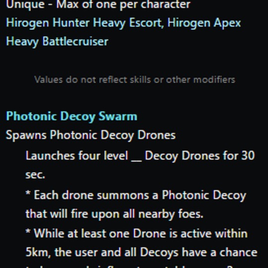This ship comes equipped with a [Console - Universal - Photonic Decoy Swarm]. This ability will baffle enemy sensors by creating a series of Photonic Decoys which create "ghost" energy and hull signatures almost identical to the vessel that deploys them. By launching several of these Decoys at a time, the effects are enough to frustrate most enemies into letting their guard down, allowing the attacking Hirogen to gain the tactical advantage in any conflict.
