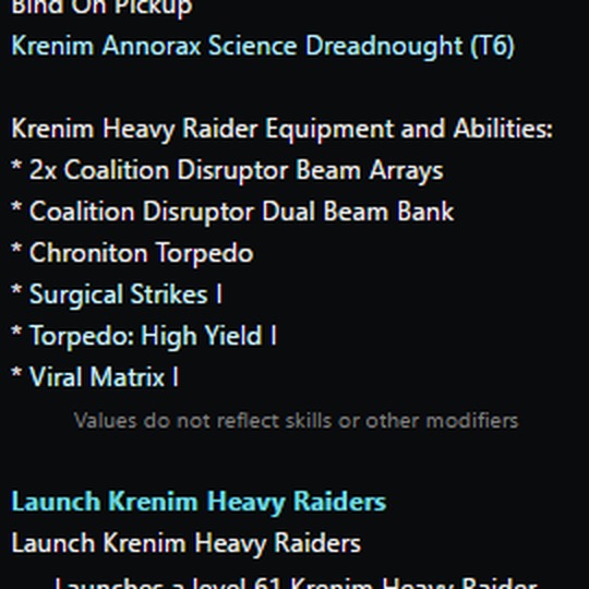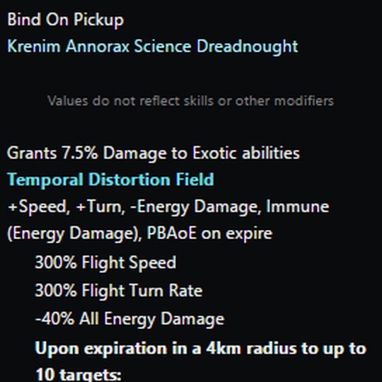 This massive starship comes with a [Console - Universal - Temporal Distortion Field] universal console. This device allows the Krenim Science Dreadnought to create a local temporal distortion field that causes your starship to partially phase out of time. While in this state your starship gains significantly increased flight speed and turn rate. In addition, the distortion causes the starship to become immune to energy damage, but also deal less energy damage for the duration of the effect. When your starship returns to normal space you will create a temporal disturbance that will cause a moderate amount of Antiproton damage, hold enemies and reduce the rate at which their abilities recharge. While equipped, this console also passively improves Exotic Damage.