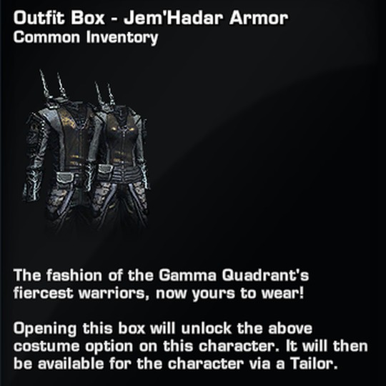 The Jem'Hadar Armor Outfit may be used by characters of either gender and any alliance.
