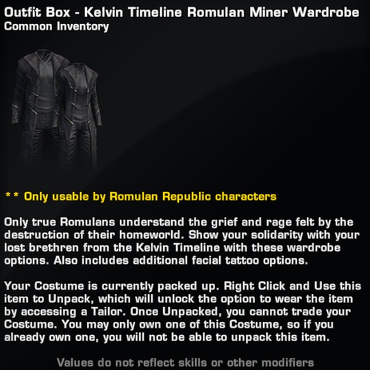 Kelvin Timeline Romulan Miner Wardrobe may only be worn by Romulan characters.