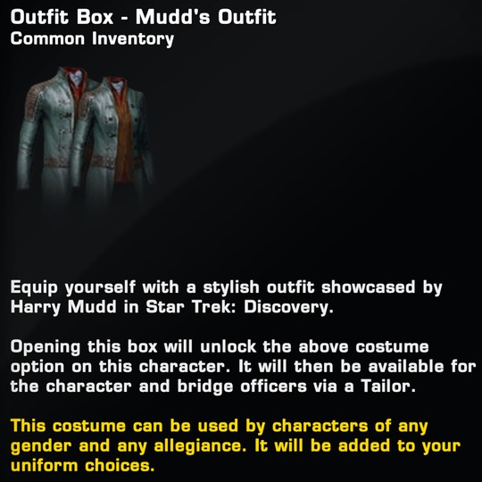 Mudd's outfit may be used by characters of either gender and any allegiance.