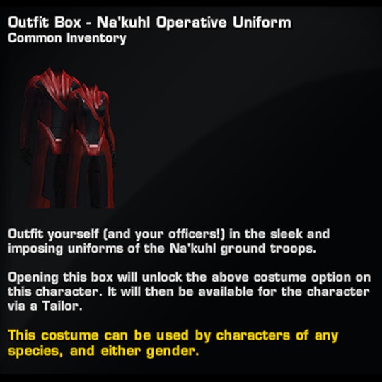 The Na'kuhl Operative Uniform may be used by characters of any faction or gender.