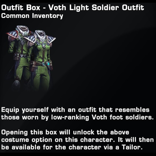 The Voth Light Soldier Outfit may be worn by characters of either faction.
